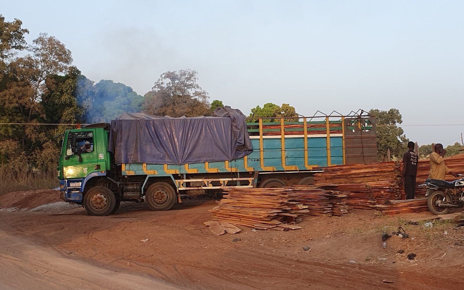 By the time the logs arrive in Kaiama, their violent journey has already been laundered. The sawmills get busy as long trucks wait to transport the sawn logs.